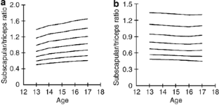 In the majority of the age groups, subscapular/triceps skinfolds ratio, trunk-to-total skinfolds percent (TTS%)and waist circumference values were significantly higher in males than in females; hip circumference was higher in females than in males, except at 15.5 years. In males, age showed a significant effect for all the body fat distribution indices; however, in females, the effect was only significant for triceps skinfold, waist and hip circumferences and waist-to-hip ratio. Smoothed age- and sex-specific triceps skinfold, subscapular skinfold, subscapular/triceps skinfolds ratio, TTS%, waist circumference and hip circumference, waist-to-hip and waist-to-height ratio percentile values for male and female adolescents have been established.