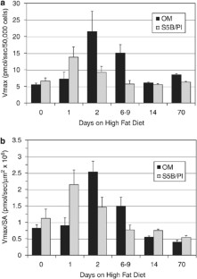 (a) Changes in Vmax contribute significantly to changes in RWG on HFDs. (b) There are important strain differences in circulating insulin and leptin responses to an HFD. (c) Both insulin and leptin responses to an HFD are closely correlated with Vmax of adipocyte fatty acid uptake in S animals, but suggest early onset of insulin resistance in OM. Thus, differences in hormonal regulation of adipocyte LCFA uptake may underlie the different responses of OM and S to HFD.