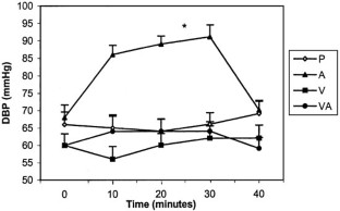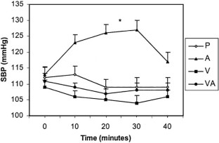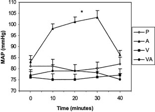 The objective of this study was to examine the effect of angiotensin II (Ang II) and angiotensin II type 1 (AT1) receptor blockade on pulse wave velocity (PWV) in healthy humans. We studied nine young male volunteers in a double-blind randomised crossover design. Carotid-femoral PWV (an index of arterial stiffness) was measured by using a Complior® machine. Subjects were previously treated for 3 days with once-daily dose of either a placebo or valsartan 80 mg. On the third day, they were infused with either placebo or 5 ng/kg/min of Ang II over 30 min. Subjects thus received placebo capsule + placebo infusion (P), valsartan + placebo infusion (V), placebo + Ang II infusion (A), and valsartan + Ang II infusion (VA) combinations. Heart rate (HR), blood pressure and PWV were recorded at baseline and then every 10 min during infusion and once after the end of infusion. There were significant increases in systolic blood pressure (SBP), diastolic blood pressure (DBP) and mean arterial pressure (MAP) with A compared with P (P = 0.002, P = 0.002, P = 0.001 respectively). These rises in blood pressure were completely blocked by valsartan. A significant rise in PWV by A was seen compared with P (8.38 ± 0.24 vs 7.48 ± 0.24 m/sec, P = 0.013) and was completely blocked by valsartan; VA compared with P (7.27 ± 0.24 vs 7.48 ± 0.24 m/sec, P = NS). Multiple linear regression analysis showed that blockade of Ang II induced increase in blood pressure by valsartan contributed to only 30% of the total reduction in Ang II induced rise in PWV (R2 = 0.306). The conclusions were that valsartan completely blocks the effect of Ang II on PWV. The effect of Ang II on PWV is mediated through AT1receptors. Reduction in PWV by Ang II antagonist is not fully explained by its pressure lowering effect of Ang II and may be partially independent of its effect on blood pressure.