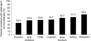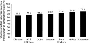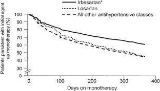 This study assessed the percentage of patients after 1 year who persisted on initially prescribed antihypertensive therapy. Medical records of 2416 patients with newly diagnosed hypertension who were prescribed initial antihypertensive monotherapy by general practitioners in Germany, France, and the United Kingdom were evaluated. Comparisons were made among the angiotensin II receptor antagonist (AIIRA) irbesartan, all other antihypertensive classes (including AIIRAs other than irbesartan), and the AIIRA losartan. Patients initiated on the AIIRA irbesartan scored highest with a persistence rate of 60.8%, followed by patients who received all other AIIRA agents with a persistence rate of 51.3%. Angiotensin-converting enzyme inhibitors, calcium channel blockers, beta-blockers, and losartan were associated with comparable persistence rates, between 42.0% and 49.7%. Patients who received diuretics scored lowest with a persistence rate of 34.4%. Persistence has emerged as an essential factor for blood pressure control. Prescribing an antihypertensive agent that provides a favourable efficacy and tolerability profile may provide greater persistence with therapy and hence a higher level of blood pressure control.