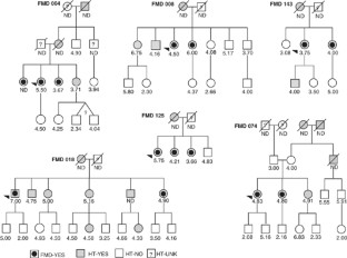We have previously shown that patients with renal fibromuscular dysplasia (FMD) have asymptomatic carotid lesions and that familial forms may occur. The objective of this study was to test whether carotid lesions could be detected in relatives of familial cases. High-resolution echotracking of the carotid artery was performed in 47 relatives of 13 cases from six families. This non-invasive investigation led to a semiquantitative arterial score that was compared with that obtained for 47 controls matched for age and sex and that for 125 sporadic cases. Familial resemblance was tested by using a generalized estimating equation approach taking into account the clustering of scores in families. As expected, FMD cases had a significantly higher score than controls (4.02 vs 2.52, P<10−5). Familial cases were not significantly different from sporadic cases. Of interest, the 47 apparently healthy relatives of familial cases had also a high carotid score (4.17), very significantly higher than that of controls (2.52, P<10−5) even though lower than the corresponding index FMD cases (4.81, P=0.01). Segregation analysis showed that 52% of the descendants of subjects with a score >4 had a score >4, a proportion consistent with autosomal-dominant transmission of the trait. Altogether these results strengthen the hypothesis of renal FMD being a systemic arterial disease and argue for a familial resemblance that may be due to a major genetic effect. The carotid score obtained by high-resolution echotracking may provide a non-invasive surrogate marker for renal FMD of potential value for use in linkage strategies on large pedigrees.
