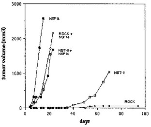 A community effect was found to occur between heterogeneous tumor cell populations leading to an overall increased tumorigenicity without a clonal dominance of the more tumorigenic clone. In the rat bladder carcinoma cell line NBT-II, this effect appears mediated by the Fibroblast Growth Factor-1 (FGF-1) through either a direct or an indirect signaling pathway. Neovascularization induced by FGF-1 was found not to be responsible for the community effect. The present study shows that the community effect does not involve a direct FGF-1 signaling since tumor cells expressing a dominant-negative FGF receptor mutant were still responding to the highly tumorigenic FGF-1 expressing cells. Tumors arising from inoculates of the FGF-1 producing NBT-II cells mixed with non tumorigenic epithelial MDCK cells contain only the tumorigenic cells indicating that MDCK cells may exerce a helper effect for the growth of the tumor not dependant on their own growth. Therefore the helper function of MDCK cells must be distinguished from a community effect where the contribution of low tumorigenic cells not only provides an in vivo growth advantage to few highly tumorigenic cells but become themselves highly tumorigenic indicating that the community effect may require cell-cell specific co-operativity independent from an helper effect.