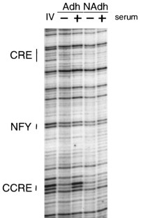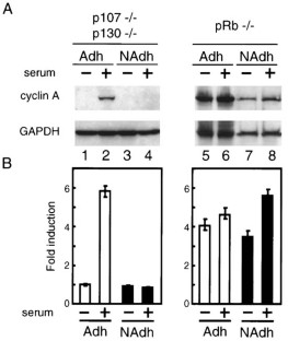 Many cells, when cultured in suspension, fail to express cyclin A, a regulatory component of cell cycle kinases cdc2 and cdk2 and as a consequence, do not enter S phase. However, many cell type-specific differences are disclosed between not only normal and transformed cells, but also between cell lines whose proliferation is strictly anchorage-dependent. These apparent discrepancies are seen in established cell lines most probably because of adaptative events that have occurred during cell culture. We have therefore used primary cells to understand how cyclin A transcription is controlled by cell anchorage properties. To this aim, we have used embryonic fibroblasts from either wild type, Rb(−/−) or p107(−/−)/p130(−/−) mice and tested the effect of an ectopic expression of Rb mutants. In the experiments reported here, we show that anchorage-dependent expression of cyclin A (i) is reflected by the in vivo occupancy of a negative DNA regulatory element previously shown to be instrumental in the down regulation of cyclin A transcription in quiescent cells (Cell Cycle Responsive Element: CCRE) (ii) requires a functional Rb but neither p107 nor p130 (iii) mutation of the CCRE abolishes both adhesion-dependent regulation and response to Rb.