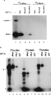 dMax, a naturally occurring splice variant of the Myc binding protein Max, lacks the DNA binding basic region and helix 1 of the Helix – Loop – Helix domain; dMax interacts with c-Myc in vitro and in vivo, and inhibits E-box Myc site driven transcription in transient transfection assays. Here we have investigated the expression, function and interactions of dMax. RT/PCR analyses detected dmax mRNA in multiple tissues of the developing, newborn and adult mouse. Functionally, dMax reduced the ability of c-Myc to cooperate with the progression factor A-Myb to promote S phase entry of quiescent smooth muscle cells. In contrast, dMax failed to ablate inhibition of initiator element (Inr)-mediated transcription by c-Myc in Jurkat T cells. In in vitro protein : protein association assays, dMax interacted with c-Myc, N-Myc, L-Myc, Mad1, Mxi1, Mad3 and Mad4, but not with itself or wild-type Max. These interactions required an intact leucine zipper. Inhibition of E-box-mediated transactivation by induction of dMax overexpression resulted in apoptosis of WEHI 231 B cells. Thus, dMax is a widely expressed, naturally occurring protein, with the capacity to bind most members of the Myc/Max superfamily; dMax has little effect on Inr-mediated repression by c-Myc, but can significantly decrease E-box-mediated events promoting proliferation and cell survival.