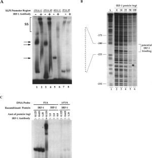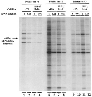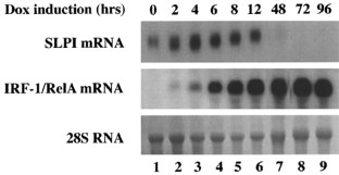 Interferon Regulatory Factor (IRF)-1 is a multifunctional transcription factor, involved in cell growth regulation, pathogen response and immune activation. To identify novel gene targets that may contribute to IRF-1 mediated activities, RNA fingerprinting was performed using NIH3T3 cells that inducibly express a hybrid form of IRF-1 under tetracycline regulated control. Secretory leukocyte protease inhibitor (SLPI) – a regulator of inflammation and an inhibitor of the LPS response – was identified as a gene repressed after doxycycline induced IRF-1 expression. Preliminary analysis of the human SLPI promoter identified an ISRE-like site located within the −221 to −200 region to which IRF-1 binds and a second, putative IRF-1 binding site upstream of the TATA box. Furthermore, co-transfection studies demonstrated that SLPI expression was inhibited by IRF-1 co-expression. The identification of SLPI as a target of IRF-1 regulation reveals a unique involvement of IRF-1 in repression of gene transcription and assigns a novel role for IRF-1 in inflammation.