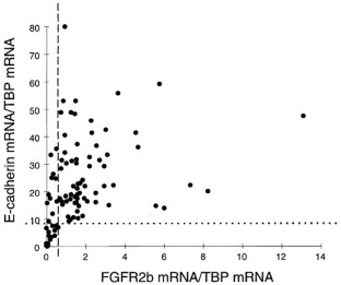 E-cadherin is a cell-cell adhesion molecule expressed predominantly by epithelial cells. Reduction or loss of E-cadherin immunoreactivity has been associated with tumour progression in many epithelial cancers, including bladder carcinomas. The fibroblast growth factor receptor 2b (FGFR2b) recognized specifically by FGF7 is expressed only by epithelial cells. Recently, decreased expression of FGFR2b protein and mRNA was found to be associated with tumour progression in bladder carcinomas. The purpose of this investigation was to look for a possible relationship between E-cadherin and FGFR2b expression in bladder carcinomas. As decreased E-cadherin immunoreactivity was found to correlate directly with decreased expression at the mRNA level, the possible relationship between E-cadherin and FGFR2b was investigated at the mRNA level using semi-quantitative RT – PCR in 92 transitional cell carcinomas (TCCs) and four lymph node metastases. All tumours with low E-cadherin expression had low expression of FGFR2b, whereas tumours with low FGFR2b mRNA could express any level of E-cadherin mRNA. The same observation was equally valid for bladder and colon cancer cell lines suggesting that, besides bladder tumours, this relationship could apply to other carcinomas types. These results suggest that a relationship exists between the transcription of the E-cadherin and FGFR2b genes preventing high expression of FGFR2b where expression of E-cadherin is low. We suggest that reduced expression of FGFR2b in conjunction with decreased expression of E-cadherin may contribute to the aggressive behaviour attributable to high grade TCCs.