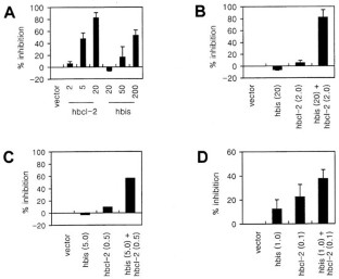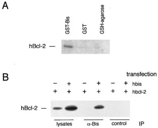 Bcl-2 is the best characterized inhibitor of apoptosis, although the molecular basis of this action is not fully understood. Using a protein interaction cloning procedure, we identified a human gene designated as bis (mapped to chromosome 10q25) that encoded a novel Bcl-2-interacting protein. Bis protein showed no significant homology with Bcl-2 family proteins and had no prominent functional motif. Co-immunoprecipitation analysis confirmed that Bis interacted with Bcl-2 in vivo. DNA transfection experiments indicated that Bis itself exerted only weak anti-apoptotic activity, but was synergistic with Bcl-2 in preventing Bax-induced and Fas-mediated apoptosis. These results suggest that Bis is a novel modulator of cellular anti-apoptotic activity that functions through its interaction with Bcl-2.