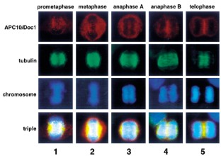 Anaphase-promoting complex or cyclosome (APC) is a ubiquitin ligase which specifically targets mitotic regulatory factors such as Pds1/Cut2 and cyclin B. Identification of the subunits of multiprotein complex APC in several species revealed the highly conserved composition of APC from yeast to human. It has been reported, however, that vertebrate APC is composed of at least eight subunits, APC1 to APC8, while budding yeast APC is constituted of at least 12 components, Apc1 to Apc13. It has not yet been clearly understood whether additional components found in budding yeast, Apc9 to Apc13, are actually composed of mammalian APC. Here we isolated and characterized human APC10/Doc1, and found that APC10/Doc1 binds to APC core subunits throughout the cell cycle. Further, it was found that APC10/Doc1 is localized in centrosomes and mitotic spindles throughout mitosis, while it is also localized in kinetochores from prophase to anaphase and in midbody in telophase and cytokinesis. These results strongly support the notion that human APC10/Doc1 may be one of the APC core subunits rather than the transiently associated regulatory factor.