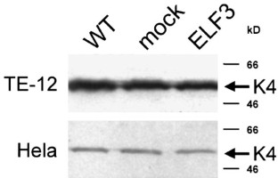 The ets family of transcription factors comprises many members which contribute to diverse cellular functions that vary depending upon the cell- and tissue-type context. Recently, different groups have identified a novel member of the ets family that is epithelial-specific. Variably called ESE-1, ERT, jen, ESX, this gene is designated currently as ELF3. In order to understand transcriptional regulatory mechanisms mediated by ELF3, we investigated its effect on the human keratin 4 gene promoter based upon the role of keratin 4 in early differentiation of the esophageal squamous epithelium. Interestingly, ELF3 suppressed basal keratin 4 promoter activity in both esophageal and cervical epithelial cancer cell lines, a novel result, while simultaneously activating the late-differentiation linked SPRR2A promoter. Furthermore, serial deletion constructs of the keratin 4 promoter continued to be suppressed by ELF3, a phenomenon that was only partially rescued by ELF3 ets domain mutants, but completely abrogated by deletion of the ELF3 pointed domain. These results suggest that ELF3 may have dual functions in the transcriptional regulation of genes involved in squamous epithelial differentiation. One of these functions may not be exclusively mediated through DNA binding in the context of transcriptional suppression of the keratin 4 promoter.