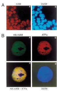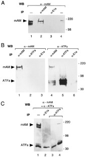 The ATFa proteins, which are members of the CREB/ATF family of transcription factors, have previously been shown to interact with the adenovirus E1a oncoprotein and to mediate its transcriptional activity; they heterodimerize with Jun, Fos or related transcription factors, possibly altering their DNA-binding specificity; they also stably bind JNK2, a stress-induced protein kinase. Here we report the identification and characterization of a novel protein isolated in a yeast two-hybrid screen using the N-terminal half of ATFa as a bait. This 1306-residue protein (mAM, for mouse ATFa-associated Modulator) is rather acidic (pHi 4.5) and contains high proportions of Ser/Thr (21%) and Pro (11%) residues. It colocalizes and interacts with ATFa in mammalian cells, contains a bipartite nuclear localization signal and possesses an ATPase activity. Transfection experiments show that mAM is able to downregulate transcriptional activity, in an ATPase-independent manner. Our results indicate that mAM interacts with several components of the basal transcription machinery (TFIIE and TFIIH), including RNAPII itself. Together, these findings suggest that mAM may be involved in the fine-tuning of ATFa-regulated gene expression, by interfering with the assembly or stability of specific preinitiation transcription complexes.