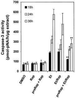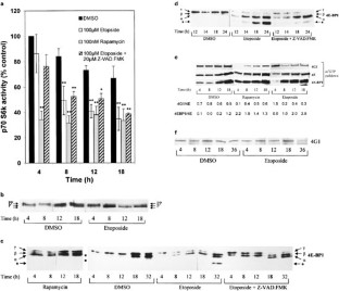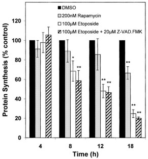 Treatment of cells with DNA-damaging agents, such as etoposide, can cause growth arrest or apoptosis. Treatment of Swiss 3T3 or RAT-1 cells with etoposide led to the dephosphorylation of both p70 S6 kinase and eukaryotic initiation factor (eIF) 4E-binding protein 1 (4E-BP1), resulting in decreased p70 S6 kinase activity and an increase in 4E-BP1 binding to eIF4E. These effects were not prevented by the general caspase inhibitor, Z-VAD.FMK. These findings indicate caspase-independent inhibition of signalling pathways that involve the mammalian target of rapamycin (mTOR). Similar effects were observed in response to two other DNA-damaging agents, cisplatin and mitomycin-C. These events preceded apoptosis, which was assessed by caspase-3 activity assays and FACS analysis. This shows that inhibition of mTOR signalling is not a consequence of apoptosis, although it may play a role in the events that precede cell death. 4E-BP1 was cleaved during apoptosis yielding a fragment that retained the ability to bind eIF4E. Cleavage of 4E-BP1 was inhibited by treatment of the cells with Z-VAD.FMK, indicating it is caspase-dependent. Insulin elicited full activation of p70 S6 kinase and phosphorylation of 4E-PB1 in etoposide-treated cells prior to the onset of apoptosis, but not during cell death. This suggests that mTOR signalling becomes irreversibly inhibited only after entry into apoptosis.