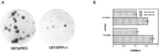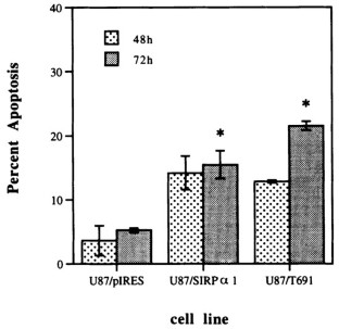 Several growth factors and cytokines, including EGF, are known to induce tyrosine phosphorylation of Signal Regulatory Proteins (SIRPs). Consistent with the idea that increased phosphorylation activates SIRP function, we overexpressed human SIRPα1 in U87MG glioblastoma cells in order to examine how SIRPα1 modulates EGFR signaling pathways. Endogenous EGFR proteins are overexpressed in U87MG cells and these cells exhibit survival and motility phenotypes that are influenced by EGFR kinase activity. Overexpression of the SIRPα1 cDNA diminished EGF-induced phosphoinositide-3-OH kinase (PI3-K) activation in U87MG cells. Reduced EGF-stimulated activation of PI3-K was mediated by interactions between carboxyl terminus of SIRPα1 and the Src homology-2 (SH2)-containing phosphotyrosine phosphatase, SHP2. SIRPα1 overexpression also reduced the EGF-induced association between SHP2 and the p85 regulatory subunit of PI3-K. Inhibition of transformation and enhanced apoptosis following γ-irradiation were observed in SIRPα1-overexpressing U87MG cells, and enhanced apoptosis was associated with reduced levels of bcl-xL protein. Furthermore, SIRPα1-overexpressing U87MG cells displayed reduced cell migration and cell spreading that was mediated by association between SIRPα1 and SHP2. However, SIRPα1-overexpressing U87MG clonal derivatives exhibited no differences in cell growth or levels of mitogen-activated protein kinase (MAPK) activation. These data reveal a pathway that negatively regulates EGFR-induced PI3-K activation in glioblastoma cells and involves interactions between SHP2 and tyrosine phosphorylated SIRPα1. These results also suggest that negative regulation of PI3-K pathway activation by the SIRP family of transmembrane receptors may diminish EGFR-mediated motility and survival phenotypes that contribute to transformation of glioblastoma cells.