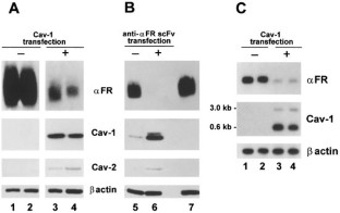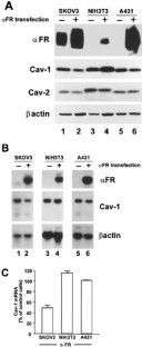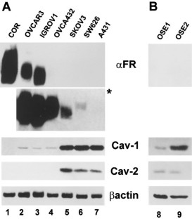 Caveolin (cav-1) and the GPI-anchored α-folate receptor (αFR) are membrane proteins both found associated to caveolar structures. Several studies in tumor cells independently reported cav-1 downregulation and αFR overexpression. Here we analysed the expression of the two molecules in normal and tumor ovarian samples derived from fresh specimens and from cultured cell lines. Whereas normal ovary surface epithelial cells displayed only cav-1 expression, ovarian tumor surgical samples and cell lines (COR, IGROV1, OVCAR3 and OVCA432) displayed high αFR and low-level or no cav-1 expression, except those cell lines (SKOV3 and SW626) with the lower αFR expression. SKOV3, but not two αFR-negative non-ovarian cell lines, exhibited downregulation of cav-1 expression following stable αFR cDNA transfection. Conversely, cav-1 transfection in IGROV1 cells led to downregulated αFR expression, together with formation of caveolar structures and reduction of growth capability. Moreover, cav-1 expression was induced in IGROV1 cells by transfection with intracellular anti-αFR antibodies to downmodulate αFR expression. In cav-1 transfected cells, transcriptional activity of the αFR-specific promoter P1 was reduced by 70% and an additional specific DNA-protein complex was identified by gel-shift assay, indicating that cav-1 expression influences αFR gene transcription. Together these results support the notion that αFR and cav-1 protein expression is reciprocally regulated in ovary cancer cells.