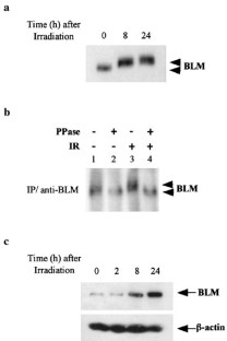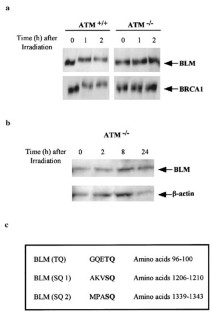 Bloom's syndrome (BS), a rare genetic disease, arises through mutations in both alleles of the BLM gene which encodes a 3′–5′ DNA helicase identified as a member of the RecQ family. BS patients exhibit a high predisposition to development of all types of cancer affecting the general population and BLM-deficient cells display a strong genetic instability. We recently showed that BLM protein expression is regulated during the cell cycle, accumulating to high levels in S phase, persisting in G2/M and sharply declining in G1, suggesting a possible implication of BLM in a replication (S phase) and/or post-replication (G2 phase) process. Here we show that, in response to ionizing radiation, BLM-deficient cells exhibit a normal p53 response as well as an intact G1/S cell cycle checkpoint, which indicates that ATM and p53 pathways are functional in BS cells. We also show that the BLM defect is associated with a partial escape of cells from the γ-irradiation-induced G2/M cell cycle checkpoint. Finally, we present data demonstrating that, in response to ionizing radiation, BLM protein is phosphorylated and accumulates through an ATM-dependent pathway. Altogether, our data indicate that BLM participates in the cellular response to ionizing radiation by acting as an ATM kinase downstream effector.