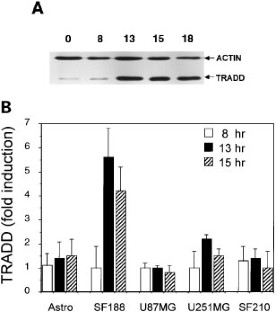 Survival of patients with Glioblastoma Multiforme (GM), a highly malignant brain tumor, remains poor despite concerted efforts to improve therapy. The median survival of patients with GM has remained approximately 1 year regardless of the therapeutic approach. Since radiation therapy is the most effective adjuvant therapy for GM and nearly half of GM tumors harbor p53 mutations, we sought to identify genes that mediate p53-independent apoptosis of GM cells in response to ionizing radiation. Using broad-scale gene expression analysis we found that following radiation treatment, TRADD expression was induced in a uniquely radiosensitive GM cell line but not in radioresistant GM cell lines. TRADD over-expression killed GM cells and activated NF-κB. We found that blocking the TRADD-mediated pathway using a dominant-negative mutant of FADD (FADD-DN) enhanced radiation resistance of GM cells, as reflected in both susceptibility to apoptosis and clonogenic survival following irradiation. Conversely, stable expression of exogenous TRADD enhanced radiation-induced apoptosis of GM cell lines, reflecting the biological significance of TRADD regulation in p53-independent apoptosis. These findings generate interest in utilizing TRADD in gene therapy for GM tumors, particularly in light of its dual function of directly inducing rapid apoptosis and sensitizing GM cells to standard anti-neoplastic therapy.