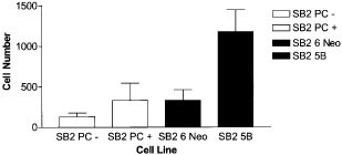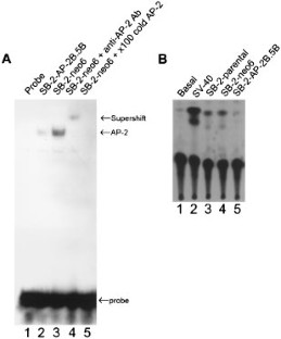 We have previously demonstrated that the transition of melanoma to the metastatic phenotype is associated with a loss of expression of the transcription factor AP-2. To further investigate the role of AP-2 in the progression of human melanoma, we attempted to inactivate AP-2 in primary cutaneous SB-2 melanoma cells by using a dominant-negative AP-2, or AP-2B, gene. AP-2B is an alternatively spliced AP-2 variant capable of inhibiting AP-2 trans-activator function. Stable transfection of primary cutaneous melanoma SB-2 cells with the dominant-negative AP-2B gene was confirmed by RT–PCR and Northern blot analyses. Electromobility shift assay using nuclear extracts from these cell lines demonstrated decreased functional binding of AP-2B-transfected cells to the AP-2 consensus binding sequence compared with neo-transfected controls. In addition, CAT activity driven by a construct containing the AP-2 consensus binding sequence was downregulated in the AP-2B transfected cells, indicating AP-2 activity was quenched in the transfected cells. Orthotopic (subcutaneous) injection of the dominant-negative (AP-2B)-transfected cell lines into nude mice increased their tumorigenicity compared to control neo-transfected cells. The AP-2B-transfected cells displayed an increase in MMP-2 expression (by Northern blot) and MMP-2 activity (by zymography), which resulted in an increase in invasiveness through Matrigel-coated filters. The AP-2B-transfected tumors also displayed an increase in MMP-2 expression, microvessel density, and angiogenesis in vivo. These results demonstrate that inactivation of AP-2 contributes to the progression of melanoma, at least partially via deregulation of the MMP-2 gene.