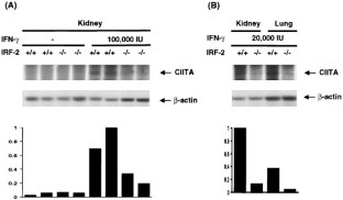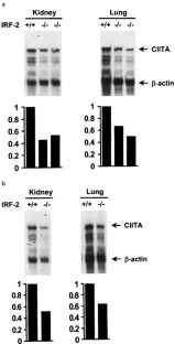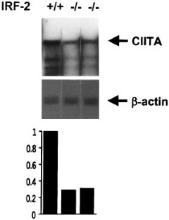 Class II transactivator (CIITA) is required for both constitutive and inducible expression of MHC class II genes. IFN-γ induced expression of CIITA in various cell types is directed by CIITA type IV promoter. The two transactivators, STAT1 and IRF-1, mediate the IFN-γ activation of the type IV promoter by binding to the GAS and IRF-E of the promoter, respectively. In addition to IRF-1, IRF-2, another member of the IRF family, also activates the human CIITA type IV promoter, and IRF-2 cooperates with IRF-1 to activate the promoter in transient transfection assays. IRF-1 and IRF-2 can co-occupy the IRF-E of the human CIITA type IV promoter. To understand the effect of loss of IRF-2 on the endogenous CIITA expression, we assayed for CIITA expression in IRF-2 knock-out mice. Both basal and IFN-γ induced CIITA expression were reduced in IRF-2 knock-out mice. At least half of the amount of inducible CIITA mRNA depends on IRF-2. The reduction of IFN-γ induced CIITA mRNA in IRF-2 knock-out mice was due to the reduction of the type IV CIITA mRNA induction. The reduction of basal CIITA mRNA was apparently due to the reduction of CIITA mRNA originating from other promoters. These data indicate that IRF-2, like IRF-1, plays a critical role in the regulation of the endogenous CIITA gene. The implications in understanding the previously described phenotypes of IRF-2 defective mice are discussed.