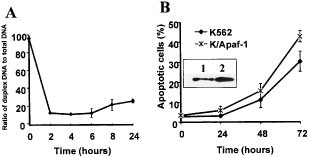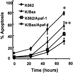 Bax translocation from cytosol to mitochondria is believed to be a crucial step for triggering cytochrome c release from mitochondria. However, it is unclear whether Bax translocation is associated with Bax induction by DNA damaging agents. The induction of Bax in response to DNA damaging agents has been considered to be linked with p53. In this study, we used the p53 negative human chronic myeloid leukaemia K562 cell line. Bax up-regulation occurred at the whole cell level after DNA damage induced by etoposide. However, after incubation with etoposide, Bax failed to translocate to mitochondria and as a result, the apoptotic process was blocked. A Bax stable transfectant, the K/Bax cell line, expressed more Bax protein in the cytosol, mitochondria and nuclei. This Bax overexpression induced cytochrome c release, a reduction of cytochrome c oxidase activity and mitochondrial membrane potential (ΔΨm). However, Bax-induced apoptosis was blocked downstream of mitochondria in K562 cells. The increased levels of mitochondrial Bax sensitized cells to etoposide-induced activation of caspases-2, -3 and -9 and apoptosis. However, after transient transfection with the Apaf-1 gene, K/Bax cells were sensitized to etoposide-induced caspase activation and apoptosis to a larger extent compared with Bax or Apaf-1 transfection alone. We therefore conclude that two mechanisms contribute to the resistance of K562 cells to etoposide-induced apoptosis; firstly failure of Bax targeting to mitochondria and, secondly, deficiency of Apaf-1. Uncoupling of Bax translocation from Bax induction can occur in response to etoposide-induced DNA damage.