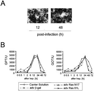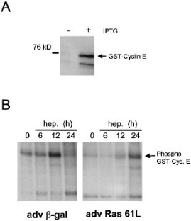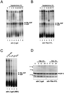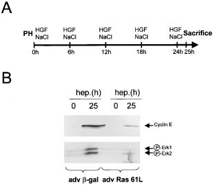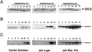 Ras-genes encode for proteins important for transmitting extracellular signals from the cytoplasm to the nucleus. In this study we investigated the impact of Ras on cell cycle progression after hepatectomy by using adenoviral vectors (adv) expressing β-galactosidase (β-gal), a dominant-negative (Ras N17) or a dominant-active (Ras 61L) form of H-Ras. Partial hepatectomy was performed in mice treated with the different adenoviruses and cell cycle progression was studied by analysing factors involved in cell cycle control during liver regeneration. After hepatectomy, adv Ras 61L increases DNA synthesis significantly in comparison to the other treatment groups. Higher Ras activity results in an early increase of transcriptional active E2F-3, which is associated with higher cyclin E, but almost unchanged cyclin D protein expression. However, Northern blot analysis and cyclin E promoter experiments indicate that, besides transcriptional mechanisms also post-transcriptional mechanisms are involved in regulating cyclin E protein expression after partial hepatectomy in mice treated with adv Ras 61L. Cyclin E phosphorylation studies demonstrate that adv Ras 61L results in hypophosphorylation of cyclin E compared to the control group at early time points after hepatectomy, when cyclin E protein expression strongly increases and there is only a minor effect on cyclin E mRNA levels. Our experiments indicate adv Ras 61L in vivo increases Cyclin E expression by higher transcription via E2F and a post-transcriptional mechanism. These mechanisms result in an earlier activation of an active CDK2/Cyclin E complex which, in turn, triggers DNA synthesis.