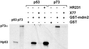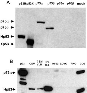 The p53 tumor suppressor gene belongs to a multigene family that includes two paralogues, p63 and p73. The structure of the p63 and p73 genes is quite similar, but both have common activities with p53, such as DNA binding and transactivation. Both p53 and p73 bind to mdm2, but only p53 is degraded through the activity of mdm2. p63 neither binds to nor is degraded by mdm2 despite important conservation in the key interacting residues. Using a panel of monoclonal antibodies raised against human and Xenopus p53, we have been able to find several antibodies that cross-react strongly with human p73. These antibodies react both with exogenous p73 expressed in mammalian cells and with endogenous p73. Interestingly, all these antibodies react with the same epitope localized in the amino-terminus of p53, but have no cross-reaction with p63. This epitope corresponds to the exact mdm2 binding site to p53. These antibodies inhibit the interaction between either p53 or p73 and mdm2, and may be useful tools for the study of these proteins. Furthermore, our studies suggest that there exist specific spatial requirements for the interaction between p53 or p73 and mdm2.