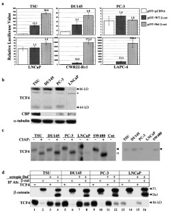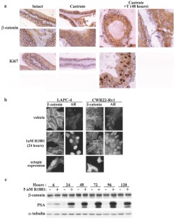 Understanding the molecular etiology of prostate cancer (CaP) progression is paramount for broadening current diagnostic and therapeutic modalities. Current interest in the role of wnt pathway signaling in prostate tumorigenesis was generated with the finding of β-catenin mutation and corresponding nuclear localization in primary lesions. The recent finding of β-catenin-induced enhancement of androgen receptor (AR) function potentially ties β-catenin to key regulatory steps of prostate cell growth, differentiation, and transformation. By immunohistological analysis of metastatic tumors, we detected nuclear β-catenin in 20% of lethal CaP cases, suggesting a more common role for β-catenin in advanced disease than would be predicted by its mutation rate. Interestingly, β-catenin nuclear localization was found to occur concomitantly with androgen-induced regrowth of normal rat prostate. These in vivo observations likely implicate β-catenin involvement in both normal and neoplastic prostate physiology, thus prompting our interest in further characterizing modes of β-catenin signaling in prostate cells. Extending our previous findings, we demonstrate that transient β-catenin over-expression stimulates T cell factor (TCF) signaling in most CaP cell lines. Further, this activity is not subject to cross-regulation by phosphoinositide-3-kinase (PI3-K)/Akt signaling, a stimulatory pathway often upregulated in CaP upon PTEN inactivation. Consistent with a previous report, we observed that transient β-catenin over-expression enhances AR-mediated transcription off two natural target gene promoters. However, we were unable to recapitulate β-catenin-induced stimulation of ectopically expressed AR in AR-negative cells, suggesting that other AR-associated factors are required for this activity. Although LNCaP cells are capable of this mode of AR co-stimulation, stable expression of mutant β-catenin did not alter their proliferative response to androgen. In total, our characterization of β-catenin signaling in CaP reveals the complex nature of its activity in prostate tissue, indicating that β-catenin potentially contributes to multiple stimulatory inputs required for disease progression.