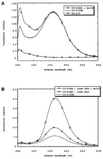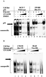 The Pfizer compound CP-31398 has been reported to stabilize the core domain of the tumour suppressor p53 in vitro and be an effective anti-cancer drug by virtue of rescuing destabilized mutants of p53. We did not detect any interaction between the p53 core domain and CP-31398 in vitro by a wide range of quantitative biophysical techniques over a wide range of conditions. CP-31398 did not stabilize p53 in our experiments. However, we found that CP-31398 intercalated with DNA and also altered and destabilized the DNA-p53 core domain complex. We analysed by NMR TROSY the interaction of the domain with a DNA oligomer and identified the changes in the complex on the binding of CP-31398. CP-31398 also decreased sequence-specific DNA binding of wild-type p53 and His-273 mutant p53. CP-31398 had a non-specific toxic effect independent of mutant p53 expression in several cell lines carrying Tet-regulated mutant p53. CP-31398 caused a small increase in MDM-2 expression and a more pronounced p53-independent increase in Bax expression. CP-31398 did, however, induce the PAb1620 epitope (characteristic of native p53) in cells expressing His-175 mutant p53. This was prevented by cycloheximide, suggesting that any stabilizing action of CP-31398 would have to be on newly synthesized p53. One of the unstable mutants that was reported to have been rescued by CP-31398, R249S, does not bind DNA when folded at lower temperatures.