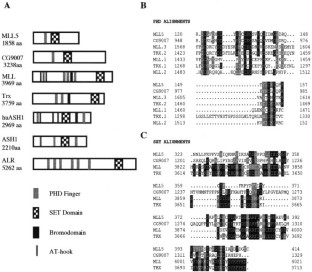 Proteins encoded by Polycomb and Trithorax-group (Pc-G and Trx-G) genes regulate developmental fates by maintaining or repressing HOX gene expression, respectively. In a search for candidate myeloid leukemia tumor suppressor genes from a ∼2.5 Mb commonly-deleted segment within chromosome band 7q22, we identified a novel human Trithorax (Trx) family member named MLL5. Trx-G genes encode proteins that modulate transcriptional programs through protein–protein interactions that are mediated by PHD and SET domains, and by binding to DNA via A-T hooks and methyltransferase homology motifs. MLL5 is a homolog of the Drosophila gene CG9007; it encodes a 6.5 kb mRNA that is expressed widely. MLL5 includes a SET domain and a single PHD finger, but lacks A-T hooks and methyltransferase homology domains that are found in MLL. The leukemia cell line RCV-ACV-A carries a heterozygous missense mutation within the PHD domain; however, no mutations within the MLL5 coding region were detected in primary leukemias. MLL5 is a novel mammalian Trx-G gene that might modulate transcription by protein association.