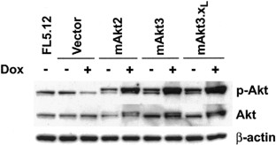 To analyse individual factors that may contribute to leukemic transformation in vivo, we have developed a murine model of leukemogenesis based on the early hematopoietic precursor cell FL5.12. FL5.12 cells are interleukin-3 (IL-3) dependent for growth, proliferation, and survival. Relative resistance to cell death following IL-3 withdrawal can be conferred by either overexpression of the Bcl-xL apoptotic inhibitor, or constitutive activation of the serine/threonine kinase Akt. The ability of Bcl-xL or a constitutively active myristylated Akt to promote leukemic transformation of FL5.12 cells was compared in athymic nu+/nu+ mice. Bcl-xL alone could not promote leukemic transformation, but mice injected with FL5.12 cells overexpressing Bcl-xL and a dominant-negative p53 construct developed leukocytosis and blastic infiltration of lymph nodes, spleen, and liver with features of a high-grade lymphoid malignancy. In contrast to the cells injected into these animals, cell lines derived from the mice were able to proliferate in the absence of IL-3, and were found to have constitutively activated Akt. This constitutive activation was associated with a variety of alterations of the signaling pathway regulating Akt activity, including alterations of PTEN mRNA and protein expression. In addition, some of these leukemic clones demonstrated concurrent constitutive upregulation of ERK activity. A constitutively active Akt construct introduced into FL5.12 cells promoted similar clonal expansion in vivo, with emergence of clonal IL-3-independent proliferation. Bcl-xL and Akt appeared to function cooperatively in this model, enhancing rapid clonal outgrowth in vivo relative to Akt alone. These results implicate activated Akt and growth-factor independence in leukemogenic transformation, and demonstrate the potential for in vivo analysis of genetic determinants of leukemogenesis.