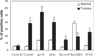 2-Amino-1-methyl-6-phenylimidazo[4,5-b]pyridine (PhIP), a compound found in cooked meat, is a mammary gland carcinogen in rats. Comparative genomic hybridization of PhIP-induced rat mammary gland carcinomas revealed loss in the centromeric region of 2q, a region known to carry the mammary carcinoma susceptibility 1 (Mcs1) gene and several other genes relevant to carcinogenesis. Allelic imbalance, specifically microsatellite instability and loss of heterozygosity, was examined in mammary gland carcinomas induced by PhIP in Sprague–Dawley (SD)×Wistar Furth F1 hybrid rats. In a polymerase chain reaction (PCR)-based assay with 34 microsatellite markers coinciding to 2q11–2q16, nine markers revealed allelic imbalance. The frequency of imbalance in the tumors varied from 10 to 100% depending on the specific marker. However, none of the markers coinciding with the Mcs1 gene locus showed allelic imbalance, suggesting that alterations at this locus were not associated with PhIP-induced rat mammary gland cancer. The expression of several genes physically mapped to 2q11–2q16 and potentially involved in carcinogenesis including Ccnb (cyclin B1), Ccnh (cyclin H), Rasa (Ras GAP), Rasgrf2, Pi3kr1 (p85α), and Il6st (gp130) was also examined by quantitative real-time PCR and immunohistochemistry (IHC) across a large bank of PhIP-induced SD rat mammary gland carcinomas. By quantitative real-time PCR, the mRNA expression of Rasa, Pi3kr1, Ccnh, and Il6st in carcinomas was, respectively, 22-, 20-, three- and threefold higher in carcinomas than in control mammary gland tissues (P<0.05, Student's t-test). A statistically sixfold lower expression of Rasgrf2 was detected in carcinomas whereas no significant change in Ccnb1 expression was observed. The findings from quantitative real-time PCR were confirmed by IHC for each gene. In addition, the proliferation index in mammary gland carcinomas as assessed by PCNA was found to correlate with the overexpression of Cyclin H by IHC analysis (P<0.05, Spearman Rank Order Correlation). The findings from the current study implicate molecular alterations in the proximal region of 2q in PhIP-induced rat mammary gland carcinomas.