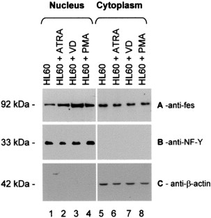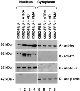 The nonreceptor tyrosine kinase Fes is implicated in myeloid cells differentiation. It has been observed that its localization can be cytoplasmic, perinuclear, or nuclear. To further characterize this point, we studied Fes subcellular localization in myeloid cell lines (HL60 and K562) and in COS1 cells. Fes was observed in both the nucleus and the cytoplasm of HL60, K562 cells overexpressing Fes and only in the cytoplasm of COS1 cells, suggesting that nuclear localization is cell context dependent. Moreover, in myeloid cells, the treatment with differentiation-inducing agents such as retinoic acid, phorbol esters and vitamin D, is followed by an increase of the oligomeric form of Fes in the nucleus. In fact, oligomerization seems to be necessary for translocation to occur, since Fes mutants missing the coiled-coil domains are not able to form oligomers and fail to localize in the nucleus. The active form of Fes is tyrosine phosphorylated; however, phosphorylation is not required for Fes to localize in the nucleus, since tyrosine kinase inhibitors do not block the translocation process.
