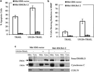 We have previously shown that Smac/DIABLO release from mitochondria appears to be the principal pathway by which TRAIL induces apoptosis of human melanoma. We report that TRAIL-induced release of Smac/DIABLO appears to be downregulated by concomitant signaling through the MEK Erk1/2 kinase pathway and that this inhibits TRAIL-induced apoptosis. Inhibition of Erk1/2 signaling by either the MEK inhibitor U0126 or a dominant-negative mutant of MKK1 markedly sensitized melanoma cells to TRAIL-induced apoptosis. The site in the apoptotic pathway acted on by U0126 appeared to be downstream of caspase-8 and Bid but upstream of caspase-3 in that the levels of proteolytic cleavage of caspase-8 and Bid by TRAIL were similar in cells with or without exposure to U0126. Caspase-3 activation and cleavage of its substrates, PARP, ICAD and XIAP, were however increased by cotreatment with U0126. This was associated with a rapid reduction in mitochondrial transmembrane potential (MMP) and increased release of Smac/DIABLO into the cytosol. Exploration of events leading to the changes in MMP revealed an increased translocation of Bax from the cytosol to mitochondria in the presence of U0126. There was also a delayed decrease in the levels of expression of Mcl-1. Bcl-2 and Bcl-XL. Over expression of Bcl-2 blocked TRAIL-induced apoptosis in the presence of U0126. Cytochrome c appeared not to play a major role in sensitization of melanoma to TRAIL in that caspase-9 activation was not detected in most of the cell lines. These results suggest that Erk1/2 signaling may protect melanoma cells against TRAIL-induced apoptosis by inhibiting the relocation of Bax from the cytosol to mitochondria and that this may reduce TRAIL-mediated release of Smac/DIABLO and induction of apoptosis.