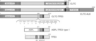 A distinctive subset of renal carcinomas is associated with Xp11.2 translocations and resulting TFE3 gene fusions (PRCC–TFE3, PSF–TFE3, NONO–TFE3, ASPL–TFE3), encoding related aberrant transcription factors. We report the cloning of a novel clathrin heavy-chain gene (CLTC)–TFE3 gene fusion resulting from a t(X;17)(p11.2;q23) in a renal carcinoma arising in a 14-year-old boy. The fusion transcript joined the 5′ exons of CLTC on chromosome band 17q23 to the 3′ exons of TFE3. CLTC encodes a major subunit of clathrin, a multimeric protein on cytoplasmic organelles, and is a known recurrent fusion partner of the ALK tyrosine kinase gene in anaplastic large-cell lymphoma and inflammatory myofibroblastic tumors. The predicted CLTC–TFE3 product retains the nuclear localization and DNA-binding domains of TFE3, but lacks the multimerization domain of CLTC. The present renal tumor demonstrated morphologic and immunohistochemical features of both PRCC–TFE3 and ASPL–TFE3 carcinomas, including strong nuclear immunoreactivity for the TFE3 C-terminal and only minimal expression of epithelial proteins. However, unlike most renal carcinomas, it also focally expressed melanocytic proteins. The present report highlights the promiscuity of certain genes involved in chromosomal translocations. Further analysis of the shared features of CLTC and other TFE3 fusion partners may shed light on the essential biology of TFE3 fusion proteins.