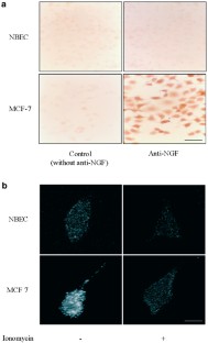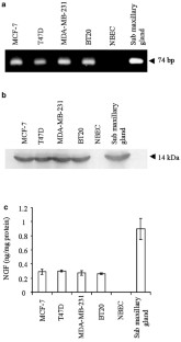 We show here that nerve growth factor (NGF), the canonical neurotrophic factor, is synthesized and released by breast cancer cells. High levels of NGF transcript and protein were detected in breast cancer cells by reverse transcription-PCR, Western blotting, ELISA assay and immunohistochemistry. Conversely, NGF production could not be detected in normal breast epithelial cells at either the transcriptional or protein level. Confocal analysis indicated the presence of NGF within classical secretion vesicles. Breast cancer cell-produced NGF was biologically active, as demonstrated by its ability to induce the neuronal differentiation of embryonic neural precursor cells. Importantly, the constitutive growth of breast cancer cells was strongly inhibited by either NGF-neutralizing antibodies or K-252a, a pharmacological inhibitor of NGF receptor TrkA, indicating the existence of an NGF autocrine loop. Together, our data demonstrate the physiological relevance of NGF in breast cancer and its potential interest as a marker and therapeutic target.