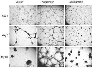 Angiomotin was identified by its ability to bind angiostatin and has been shown to mediate its activity in vitro. The family of angiomotin-like protein consists of three members that have coiled-coil domains and conserved c-terminal PDZ-binding motifs. We show here that expression of angiomotin in mouse aortic endothelial (MAE) cells results in stabilization of tubes in the Matrigel assay. Control tubes start to regress after 72 h, whereas MAE-angiomotin (MAE Amot) tubes were stable for over 30 days. In contrast, cells expressing a functional mutant lacking the PDZ protein interaction motif did not migrate and form tubes. Cells from the established tubes invaded into the solidified matrigel. We therefore tested whether angiomotin promotes endothelial invasion. In microcarrier-based invasion in vitro assay, angiomotin-expressing cells invaded collagen matrix and formed tube-like branches. This was confirmed in vivo as injection of MAE-Amot cells promoted tumor growth and invasion into surrounding muscle tissue. Injection of cells transfected with the functional mutant resulted in establishment of noninvasive tumors surrounded by a capsule of fibrous tissue. These tumors remained in constant size or dormant over 3 weeks. Zymogel analysis of the transfected cells did not reveal any differences in proteolytic activity. However, time-lapse photography showed a significant increase in random motility in MAE-Amot cells. We conclude that angiomotin may promote angiogenesis by both stimulating invasion as well as stabilizing established tubes.
