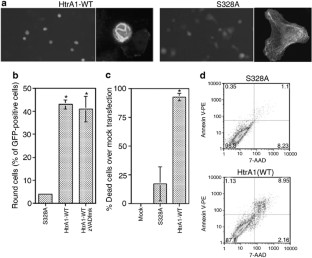We report here that HtrA1, a candidate tumor suppressor, is downregulated in ovarian cancer. Expression of HtrA1 is downregulated in five of seven ovarian cancer cell lines. In total, 59% of primary ovarian tumors have either a complete absence or markedly reduced levels of HtrA1 expression compared to the brushings of ovarian surface epithelium. Primary ovarian tumors show high frequencies of loss of an allele at microsatellite markers near htrA1 locus on 10q26. Downregulation of HtrA1 in SKOV3 by antisense transfection promotes anchorage-independent growth, while exogenous expression of HtrA1 in OV202 induces cell death. HtrA1-induced cell death is not inhibited by the broad caspase inhibitor, zVAD(OMe)fmk, but instead reflects serine protease activity associated with HtrA1. These observations raise the possibility of HtrA1 as a candidate tumor suppressor involved in promoting serine-protease-mediated cell death and that downregulation of HtrA1 in ovarian cancer may contribute to malignant phenotype.