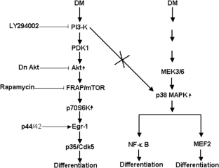 Cdk5 regulates myogenesis but the signaling cascade through which Cdk5 modulates this process remains to be characterized. Here, we investigated whether PI3K, Akt, p70S6K, p38 MAPK, p44/42 MAPK, and Egr-1 serve as upstream regulators of Cdk5 during L6 myoblast differentiation. Upon serum reduction, we found that besides elevated expression of Cdk5 and its activator, p35, and increased Cdk5/p35 activity, Egr-1, Akt, p70S6K, and p38 MAPK activity were upregulated in differentiating L6 cells. However, p44/42 MAPK was downregulated and SAPK/JNK was unaffected. LY294002, a PI3K inhibitor, blocked the activation of Akt and p70S6K, indicating that Akt and p70S6K activation is linked to PI3K activation. The lack of LY294002 effect on p38 MAPK suggests that p38 MAPK activation is not associated with PI3K activation. Rapamycin, a specific inhibitor of FRAP/mTOR (the upstream kinase of p70S6K), also blocked p70S6K activation, indicating the involvement of FRAP/mTOR activation. LY294002 and rapamycin also blocked the enhancement of Egr-1 level, Cdk5 activity, and myogenin expression, suggesting that upregulation of these factors is coupled to PI3K–p70S6K activation. Overexpression of dominant-negative-Akt also reduced Cdk5/p35 activity and myogenin expression, indicating that the PI3K–p70S6K–Egr-1–Cdk5 signaling cascade is linked to Akt activation. SB2023580, a p38 MAPK inhibitor, had no effect on p70S6K, Egr-1, or Cdk5 activity, suggesting that p38 MAPK activation lies in a pathway distinct from the PI3K–Akt–p70S6K–Egr-1 pathway that we identify as the upstream modulator of Cdk5 activity during L6 myoblast differentiation.