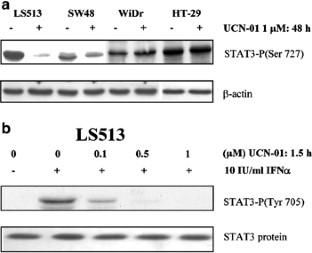 The broad-range cyclin-dependent kinase inhibitor 7-hydroxystaurosporine (UCN-01) is known to induce both a G1 cell cycle arrest and apoptosis. The mechanism of UCN-01-induced apoptosis is largely unknown. We analysed the mechanism of cytotoxicity of UCN-01 in four established colon carcinoma cell lines. The cell lines SW48 and LS513 responded to UCN-01 treatment by undergoing apoptosis in a concentration-dependent manner while the cell lines HT-29 and WiDr were completely resistant. Apoptosis in LS513 and SW48 cell lines was concomitant with the suppression of Bcl-xL on mRNA and protein level. In contrast, in the apoptosis-resistant cell lines, Bcl-xL expression was not affected by UCN-01. Stable overexpression of the Bcl-xL protein abrogated UCN-01-triggered apoptosis, but only partially restored growth, indicating that both cell cycle arrest and apoptosis exert the anticancer effect in a coordinated manner. The inhibition of Akt phosphorylation did not correlate with the apoptotic phenotype. UCN-01 inhibited the activating STAT3 phosphorylations on Ser727 and, notably, on Tyr705, but STAT3 did not contribute to Bcl-xL expression in colon carcinoma cells. Moreover, we show for the first time that UCN-01 induces apoptosis by suppression of Bcl-xL expression. The inhibition of this pathway is a new aspect of cytotoxic and modulatory potential of UCN-01.