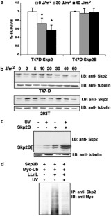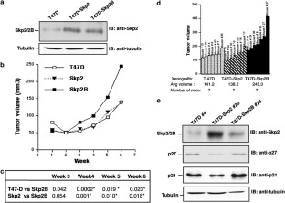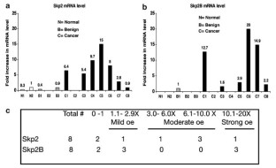 Skp2 is an F-box protein involved in the ubiquitination and subsequent degradation of the cyclin-dependent kinase (Cdk) inhibitor p27. Skp2 has been reported to be overexpressed in a variety of cancer types and to correlate with poor prognosis. We have identified a novel isoform of Skp2 we named Skp2B, which differs from Skp2 only in the C-terminal domain and unlike Skp2 localizes to the cytoplasm. Here, we describe the relative expression of both Skp2 and Skp2B in breast cancer cell lines and in primary breast cancers using quantitative real time RT–PCR. We show that Skp2B mRNA is expressed 10-fold less than Skp2 mRNA in the immortalized but non-transformed breast cell line, 184B5. However, Skp2B is overexpressed as frequently as Skp2, and to higher levels than Skp2 in breast cancer cell lines and primary cancers. Further, we show that cytoplasmic staining is frequent in primary breast cancers. In addition, we found that xenografts expressing Skp2B grow faster than xenografts expressing low levels of Skp2B, and that this effect is independent of p27 degradation. These findings therefore suggest that Skp2B overexpression is also observed in breast cancers and identify Skp2B as a putative oncogene.