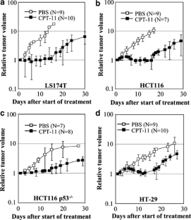 Knowledge of the type of biological reaction to chemotherapy is a prerequisite for its rational enhancement. We previously showed that irinotecan-induced DNA damage triggers in the HCT116p53wt colon carcinoma cell line a long-term cell cycle arrest and in HCT116p53−/− cells apoptosis (Magrini et al., 2002). To compare the contribution of long-term cell cycle arrest and that of apoptosis to inhibition of cell proliferation after irinotecan-induced DNA damage, we used this isogenic system as well as the cell lines LS174T (p53wt) and HT-29 (p53mut). Both p53wt cell lines responded to damage by undergoing a long-term tetraploid G1 arrest, whereas the p53mut cell lines underwent apoptosis. Cell cycle arrest as well as apoptosis caused a similar delay in cell proliferation. Irinotecan treatment also induced in mouse tumours derived from the p53wt cell lines a tetraploid G1 arrest and in those derived from the p53-deficient cell lines a transient G2/M arrest and apoptosis. The delay of tumour growth was in the same range in both groups, that is, arrest- and apoptosis-mediated tumour growth inhibition was comparable. In conclusion, cell cycle arrest as well as apoptosis may be equipotent mechanisms mediating the chemotherapeutic effects of irinotecan.