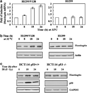The p53 protein is a transcription factor that integrates various cellular stress signals. The accumulation of the mutant huntingtin protein with an expanded polyglutamine tract plays a central role in the pathology of human Huntington's disease. We found that the huntingtin gene contains multiple putative p53-responsive elements and p53 binds to these elements both in vivo and in vitro. p53 activation in cultured human cells, either by a temperature-sensitive mutant p53 protein or by gamma-irradiation (γ-irradiation), increases huntingtin mRNA and protein expression. Similarly, murine huntingtin also contains multiple putative p53-responsive elements and its expression is induced by p53 activation in cultured cells. Moreover, γ-irradiation, which activates p53, increases huntingtin gene expression in the striatum and cortex of mouse brain, the major pathological sites for Huntington's disease, in p53+/+ but not the isogenic p53−/− mice. These results demonstrate that p53 protein can regulate huntingtin expression at transcriptional level, and suggest that a p53 stress response could be a modulator of the process of Huntington's disease.
