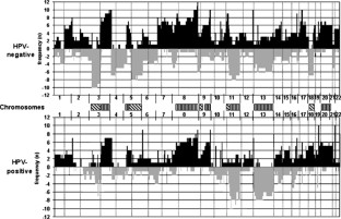 Oncogene-expressing human papillomavirus type 16 (HPV16) is found in a subset of head and neck squamous cell carcinomas (HNSCC). HPV16 drives carcinogenesis by inactivating p53 and pRb with the viral oncoproteins E6 and E7, paralleled by a low level of mutations in TP53 and allelic loss at 3p, 9p, and 17p, genetic changes frequently found in HNSCCs of nonviral etiology. We hypothesize that two pathways to HNSCC exist: one determined by HPV16 and the other by environmental carcinogens. To define the critical genetic events in these two pathways, we now present a detailed genome analysis of HNSCC with and without HPV16 involvement by employing high-resolution microarray comparative genomic hybridization. Four regions showed alterations in HPV-negative tumors that were absent in HPV-positive tumors: losses at 3p11.2–26.3, 5q11.2–35.2, and 9p21.1–24, and gains/amplifications at 11q12.1–13.4. Also, HPV16-negative tumors demonstrated loss at 18q12.1–23, in contrast to gain in HPV16-positive tumors. Seven regions were altered at high frequency (>33%) in both groups: gains at 3q22.2-qter, 5p15.2-pter, 8p11.2-qter, 9q22–34.1, and 20p–20q, and losses at 11q14.1-qter and 13q11–33. These data show that HNSCC arising by environmental carcinogens are characterized by genetic alterations that differ from those observed in HPV16-induced HNSCC, and most likely occur early in carcinogenesis. A number of genetic changes are shared in both tumor groups and can be considered crucial in the later stages of HNSCC progression.
