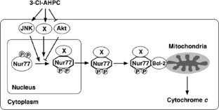 Proapoptotic nuclear receptor family member Nur77 translocates from the nucleus to the mitochondria, where it interacts with Bcl-2 to trigger apoptosis. Nur77 translocation is induced by certain apoptotic stimuli, including the synthetic retinoid-related 6-[3-(1-adamantyl)-4-hydroxyphenyl]-2-naphthalenecarboxylic acid (AHPN)/CD437 class. In this study, we investigated the molecular mechanism by which AHPN/CD437 analog (E)-4-[3-(1-adamantyl)-4-hydroxyphenyl]-3-chlorocinnamic acid (3-Cl-AHPC) induces Nur77 nuclear export. Our results demonstrate that 3-Cl-AHPC effectively activated Jun N-terminal kinase (JNK), which phosphorylates Nur77. Inhibition of JNK activation by a JNK inhibitor suppressed 3-Cl-AHPC-induced Nur77 nuclear export and apoptosis. In addition, several JNK upstream activators, including the phorbol ester TPA, anisomycin and MAPK kinase kinase-1 (MEKK1), phosphorylated Nur77 and induced its nuclear export. However, Nur77 phosphorylation by JNK, although essential, was not sufficient for inducing Nur77 nuclear export. Induction of Nur77 nuclear export by MEKK1 required a prolonged MEKK1 activation and was attenuated by Akt activation. Expression of constitutively active Akt prevented MEKK1-induced Nur77 nuclear export. Conversely, transfection of dominant-negative Akt or treatment with a phosphatidylinositol 3-kinase (PI3-K) inhibitor accelerated MEKK1-induced Nur77 nuclear export. Furthermore, mutation of an Akt phosphorylation residue Ser351 in Nur77 abolished the effect of Akt or the PI3-K inhibitor. Together, our results demonstrate that both activation of JNK and inhibition of Akt play a role in translocation of Nur77 from the nucleus to the cytoplasm.