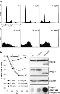 The ‘human topoisomerase I (htopoI) damage response’ was reported to be triggered by various kinds of DNA lesions. Also, a high and persistent level of htopoI cleavage complexes correlated with apoptosis. In the present study, we demonstrate that DNA damage-independent induction of cell death using colcemid and tumor necrosis factor α is also accompanied by a strong htopoI response that correlates with the onset of apoptotic hallmarks. Consequently, these results suggest that htopoI cleavage complex formation may be caused by signaling pathways independent of the kind of cellular stress. Thus, protein interactions or signaling cascades induced by DNA damage or cellular stress might lead to the formation of stabilized cleavage complexes rather than the DNA lesion itself. Finally, we show that p53 not only plays a key role in the regulation of the htopoI response to UV-C irradiation but also to treatment with colcemid.