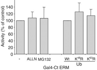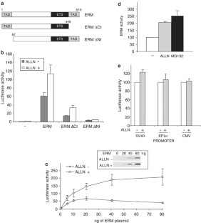 ERM is a member of the ETS transcription factor family. High levels of the corresponding mRNA are detected in a variety of human breast cancer cell lines, as well as in aggressive human breast tumors. As ERM protein is almost undetectable in these cells, high degradation of this transcription factor has been postulated. Here we have investigated whether ERM degradation might depend on the proteasome pathway. We show that endogenous and ectopically expressed ERM protein is short-lived protein and undergoes proteasome-dependent degradation. Deletion mutagenesis studies indicate that the 61 C-terminal amino acids of ERM are critical for its proteolysis and serve as a degradation signal. Although ERM conjugates with ubiquitin, this post-translational modification does not depend on the C-terminal domain. We have used an Ets-responsive ICAM-1 reporter plasmid to show that the ubiquitin–proteasome pathway can affect transcriptional function of ERM. Thus, ERM is subject to degradation via the 26S proteasome pathway, and this pathway probably plays an important role in regulating ERM transcriptional activity.