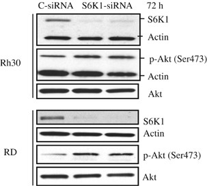Rapamycin and several analogs, such as CCI-779 and RAD001, are currently undergoing clinical evaluation as anticancer agents. In this study, we show that inhibition of mammalian target of rapamycin (mTOR) signaling by rapamycin leads to an increase of Akt phosphorylation in Rh30 and RD human rhabdomyosarcoma cell lines and xenografts, and insulin-like growth factor (IGF)-II-treated C2C12 mouse myoblasts and IGF-II-overexpressing Chinese hamster ovary cells. RNA interference-mediated knockdown of S6K1 also results in an increase of Akt phosphorylation. These data suggest that mTOR/S6K1 inhibition either by rapamycin or small interfering RNA (siRNA) triggers a negative feedback loop, resulting in the activation of Akt signaling. We next sought to investigate the mechanism of this negative feedback regulation from mTOR to Akt. Suppression of insulin receptor substrate (IRS)-1 and tuberous sclerosis complex-1 by siRNAs failed to abrogate rapamycin-induced upregulation of Akt phosphorylation in both Rh30 and RD cells. However, pretreatment with h7C10 antibody directed against insulin-like growth factor-1 receptor (IGF-1R) led to a blockade of rapamycin-induced Akt activation. Combined mTOR and IGF-1R inhibition with rapamycin and h7C10 antibody, respectively, resulted in additive inhibition of cell growth and survival. These data suggest that rapamycin mediates Akt activation through an IGF-1R-dependent mechanism. Thus, combining an mTOR inhibitor and an IGF-1R antibody/inhibitor may be an appropriate strategy to enhance mTOR-targeted anticancer therapy.