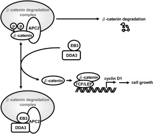 We have previously identified mouse DDA3 as a p53-inducible gene. To explore the functional role of DDA3, we screened a mouse brain cDNA library by the yeast two-hybrid assay, and identified the microtubule plus-end binding protein EB3 as a DDA3-interacting protein. Binding of DDA3 to EB3 was verified by glutathione S-transferase (GST) pull-down assay and subcellular colocalization; co-immunoprecipitation further indicated that interaction of these two proteins within cells required intact microtubules. Domains of DDA3-EB3 interaction were mapped by GST pull-down assay to amino acids 118–241 and 242–329 of DDA3 and the N- and C-termini of EB3. Immunofluorescence analysis revealed colocalization of DDA3 with microtubules in various cell phases, and regions encompassing aa 118–241 and 242–329 contained microtubule-interacting and bundling activities. In vitro microtubule-binding assay showed that DDA3 and EB3 associated directly with microtubules, and cooperated with each other for microtubule binding. In addition, DDA3 bound to the EB3 interacting partner adenomatous polyposis coli 2 (APC2), a homolog of the tumor suppressor APC, which is a component of the β-catenin destruction complex. Ectopic expression of DDA3 and EB3 enhanced β-catenin-dependent transactivation and cyclin D1 production, whereas knockdown of endogenous DDA3 or EB3 inhibited β-catenin-mediated transactivation and the ability of cells to form colonies. Together, our results identify DDA3 as a novel microtubule-associated protein that binds to EB3, and implicate DDA3 and EB3 in the β-catenin-mediated growth signaling.