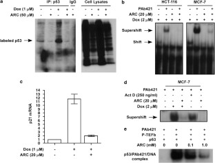 Tumor suppressor p53 is stabilized in response to γ-irradiation or treatment with DNA-damaging agents, and as a result p53 transcriptionally activates its targets leading to cell-cycle arrest or apoptosis. P-TEFb (positive transcription elongation factor b) inhibitors such as flavopiridol or 4-amino-6-hydrazino-7-b-d-ribofuranosyl-7H-pyrrolo[2,3-d]-pyrimidine-5-carboxamide (ARC) upregulate p53 protein levels, but inhibit the expression of its targets p21 and hdm2. DNA-damaging agents, doxorubicin and cisplatin are being used in combination with P-TEFb inhibitor flavopiridol in clinical trials for the treatment of some cancer patients. In this study, we found that P-TEFb inhibitors block the phosphorylation of p53 induced by doxorubicin. Furthermore, treatment of cells with P-TEFb inhibitors together with doxorubicin inhibits doxorubicin-induced binding of p53 to DNA and p53 transcriptional activity. These data suggest that P-TEFb inhibitors may antagonize the activation of p53 by DNA-damaging agents in tumors with wild-type p53.