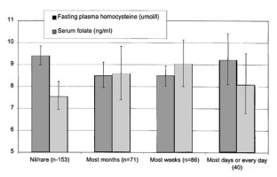 Design: A careful alcohol history was obtained from 350 (male:female 1:5) consecutive patients as part of preoperative assessment for surgical treatment of obesity. Data were obtained concerning amount, frequency, timing and type of alcohol consumption. Fasting homocysteine, serum folate and vitamin B12 concentrations were measured. Differences between groups were assessed using Student t-test, and ANOVA. Linear regression was used to assess factors influencing homocysteine concentration.