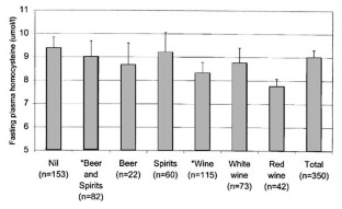 Conclusion: Mild to moderate alcohol consumption, especially red wine consumption, in obese subjects is associated with lower fasting homocysteine concentrations. This may reduce cardiovascular risk and help explain the ‘French paradox’.