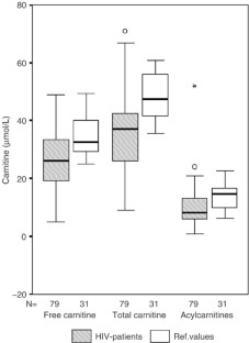 Results: Serum free and total carnitine, acylcarnitines, methionine and lysine were significantly lower in HIV-infected children compared with our reference values for similar ages (P<0.0001; Student's t-test). Low carnitine values were observed in 37% of our HIV-infected children. A significantly positive correlation was observed between serum total carnitine and methionine or lysine (P<0.0001 and P=0.005, respectively; Pearson test). No relation was observed between serum carnitine and clinical stage of HIV infection, immunological or nutritional status or lipodystrophy. Free and total carnitine were significantly lower (P=0.002 and 0.033, respectively) in HIV-infected patients on protease inhibitors (N=56) compared with those on other treatments (N=23).